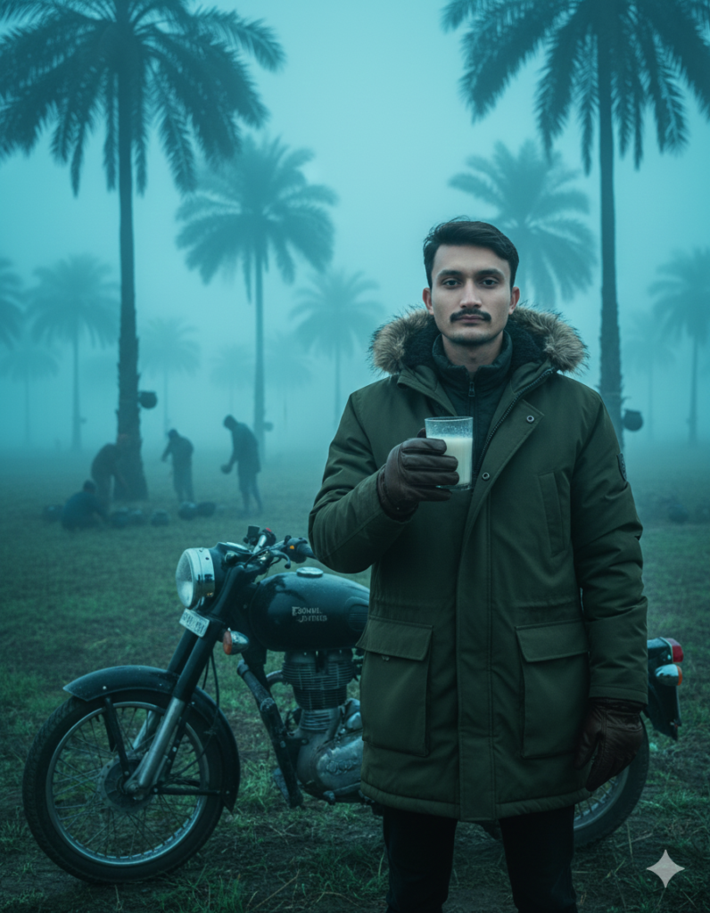 8K cinematic winter frame. A person wearing a dark olive parka coat with a fur-lined hood and leather winter gloves. Beside him is a matte black Royal-Enfield–style bike. He is holding a glass of date-palm sap (khejurer rosh). In the background: foggy fields, khajur (date-palm) trees, and the area blurred out with standing figures near collection pots. Super-saturated greens and blues, heavy fog, Bangladesh early-morning winter aesthetic. 3:4 ratio. Keep my face 100% same as in the reference image
